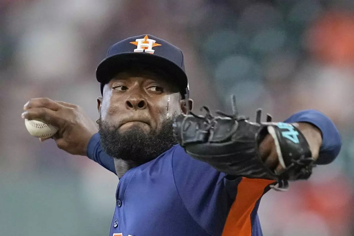 Houston Astros starting pitcher Cristian Javier throws against the Baltimore Orioles during the first inning of a baseball game Sunday, Aug. 17, 2025, in Houston. (AP Photo/David J. Phillip)