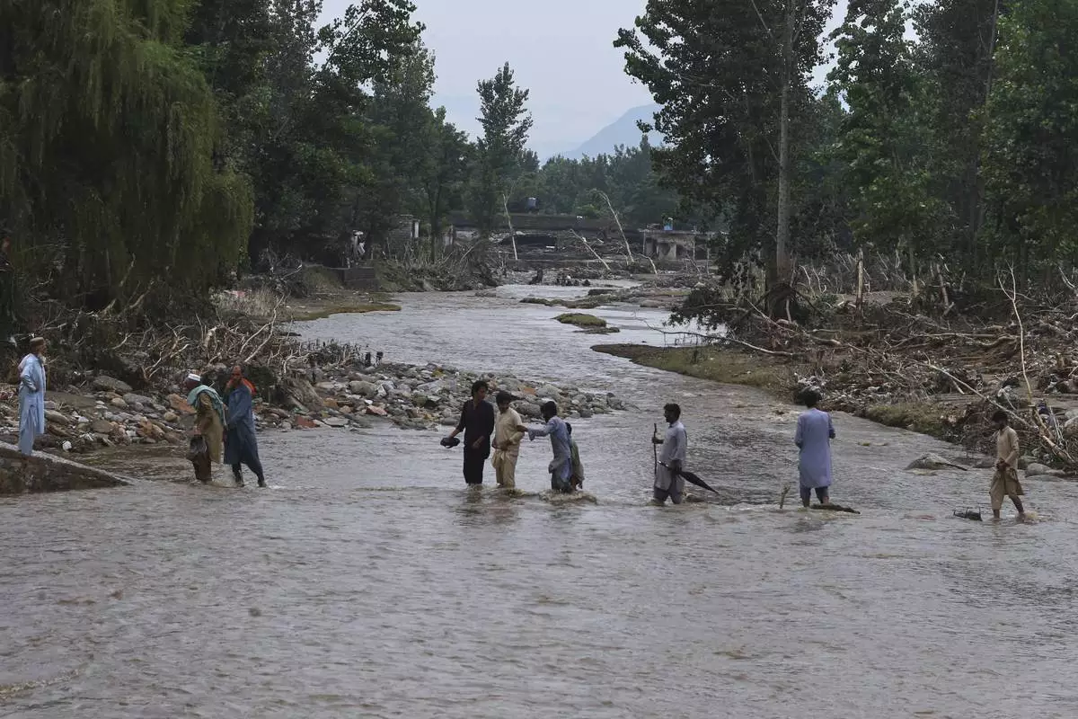Local residents cross a stream following Friday's flash flooding hit area in Pishoreen village in Buner district, in Pakistan's northwest, Sunday, Aug. 17, 2025. (AP Photo/Muhammad Sajjad)