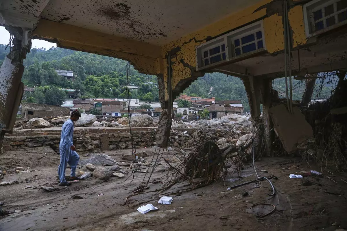A local resident looks a damaged home following Friday's flash flooding at a neighborhood of Pir Baba, an area of Buner district, in Pakistan's northwest, Sunday, Aug. 17, 2025. (AP Photo/Muhammad Sajjad)