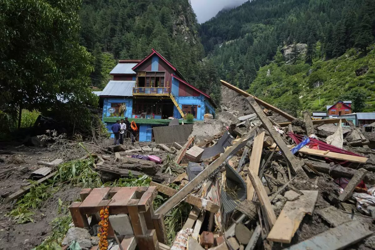 Buildings damaged by Thursday's flash floods are seen in Chositi village, Kishtwar district, Indian-controlled Kashmir, Friday, Aug. 15, 2025. (AP Photo/Channi Anand)