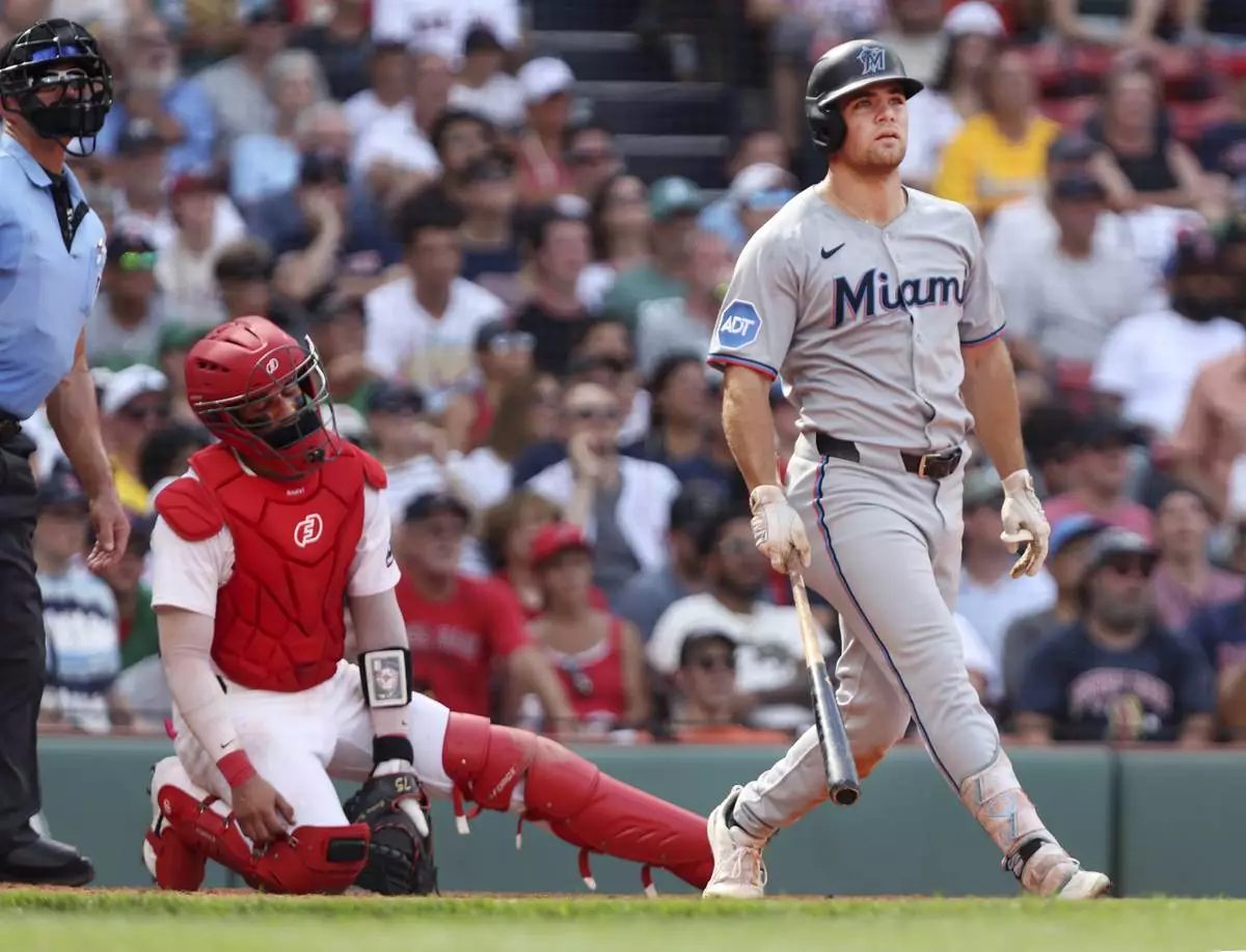 The Miami Marlins' Jakob Marsee, right, watches the flight of his two-run home run in the ninth inning, while Boston Red Sox's catcher Carlos Narvaez reacts at left during a baseball game, Sunday Aug.17, 2025 in Boston. (AP Photo/Jim Davis)