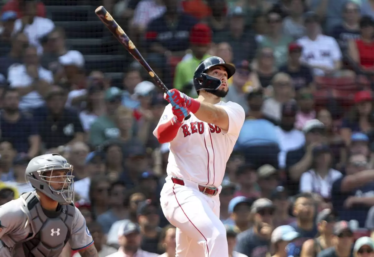 Boston's Wilyer Abreu had a two-run homer that popped out of the glove of right fielder Myers when he crashed into the fence.