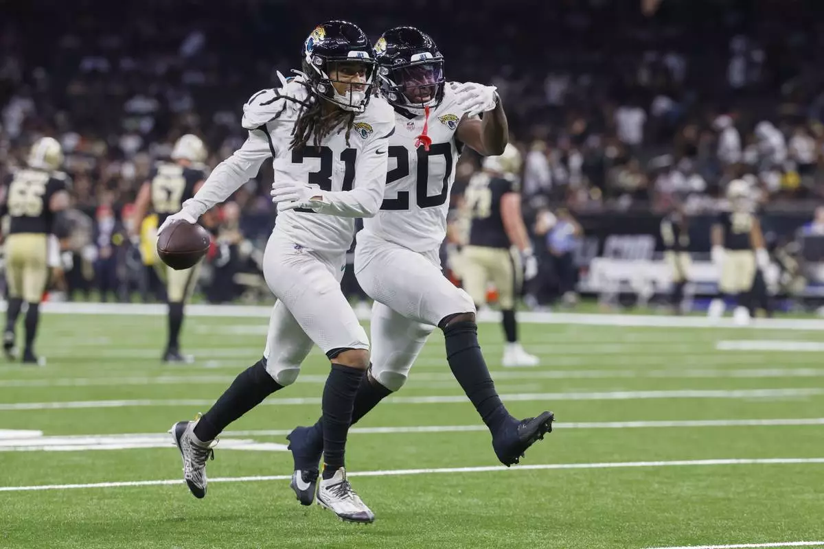 Jacksonville Jaguars cornerback Keni-H Lovely (31) celebrates a pass interception against the New Orleans Saints with safety Daniel Thomas (20) in the second half of an NFL preseason football game in New Orleans, Sunday, Aug. 17, 2025. (AP Photo/Butch Dill)