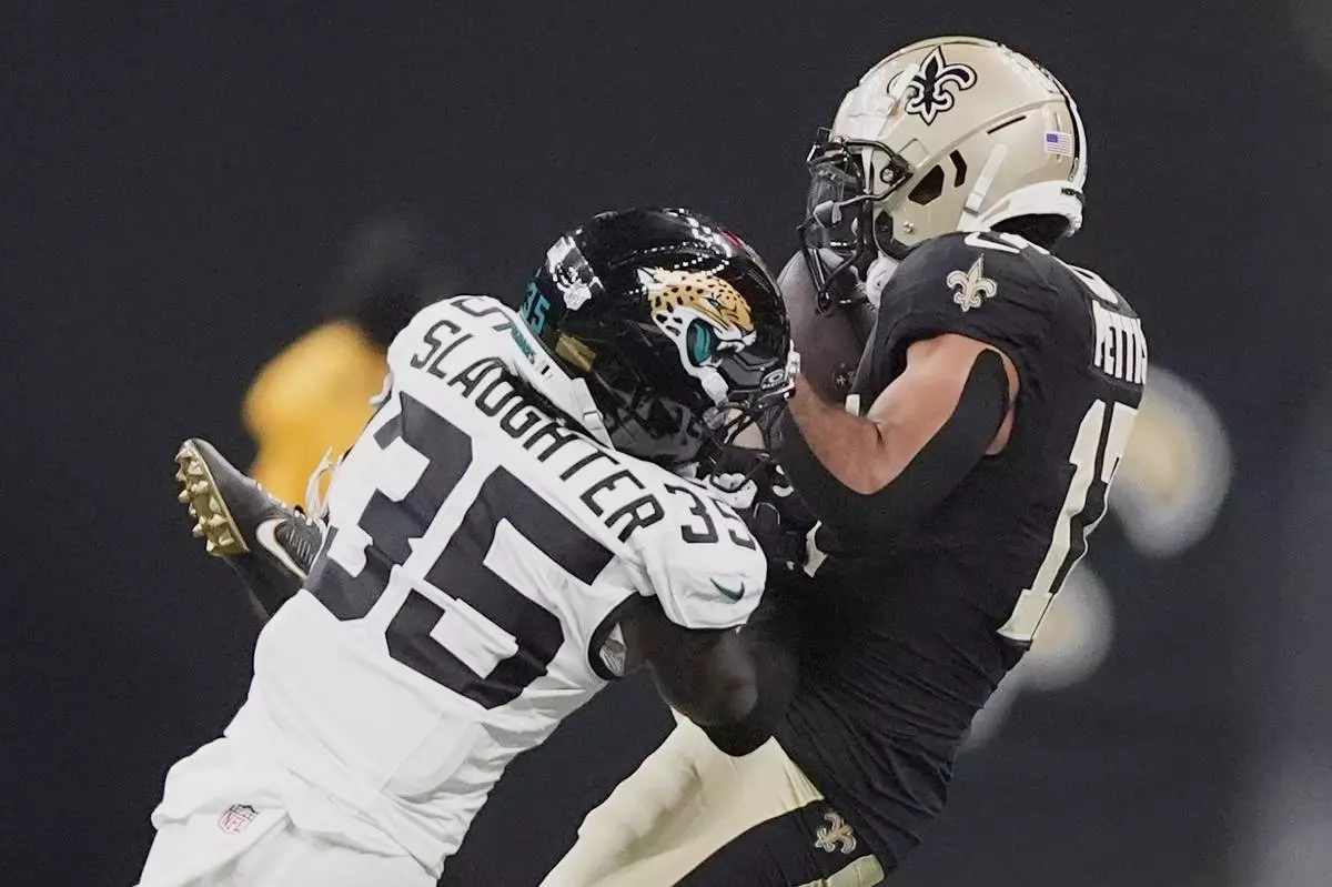 New Orleans Saints wide receiver Dante Pettis makes a reception against Jacksonville Jaguars cornerback Doneiko Slaughter (35) in the second half of an NFL preseason football game in New Orleans, Sunday, Aug. 17, 2025. (AP Photo/Gerald Herbert)