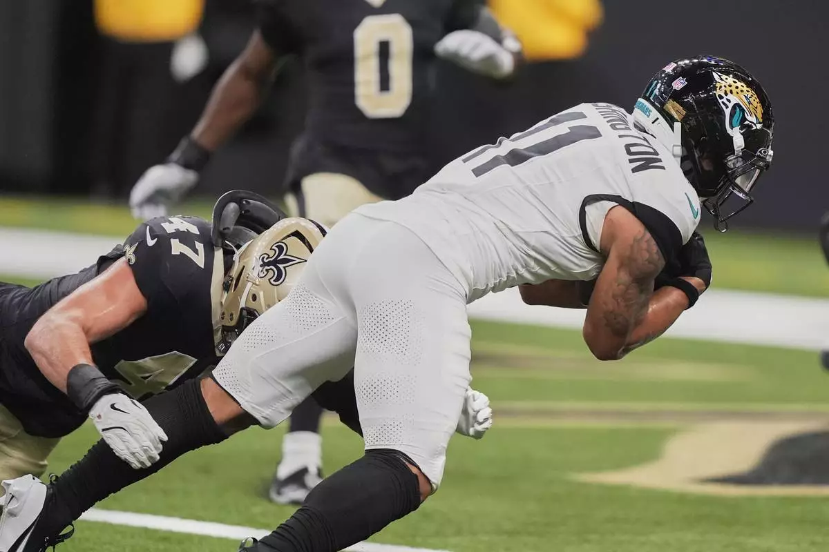 Jacksonville Jaguars wide receiver Parker Washington (11) makes a reception for a touchdown on a 7-yard pass play against New Orleans Saints linebacker Danny Stutsman (47) in the first half of an NFL preseason football game in New Orleans, Sunday, Aug. 17, 2025. (AP Photo/Gerald Herbert)