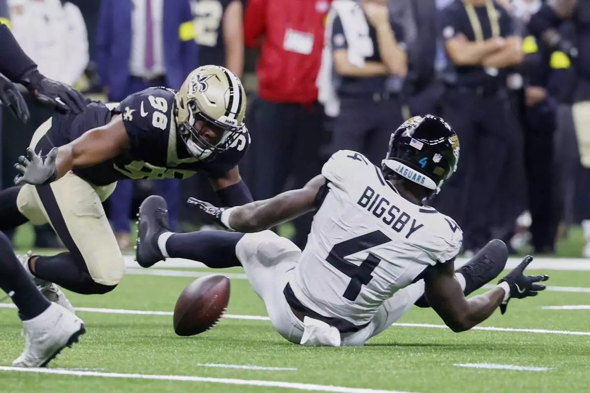 Jacksonville Jaguars running back Tank Bigsby (4) fumbles the ball as New Orleans Saints defensive end Carl Granderson (96) makes the recovery in the first half of an NFL preseason football game in New Orleans, Sunday, Aug. 17, 2025. (AP Photo/Butch Dill)