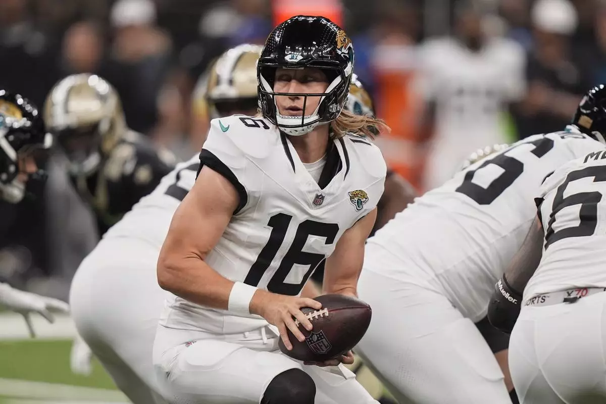 Jacksonville Jaguars quarterback Trevor Lawrence (16) prepares to hand off in the first half of an NFL preseason football game against the New Orleans Saints in New Orleans, Sunday, Aug. 17, 2025. (AP Photo/Gerald Herbert)