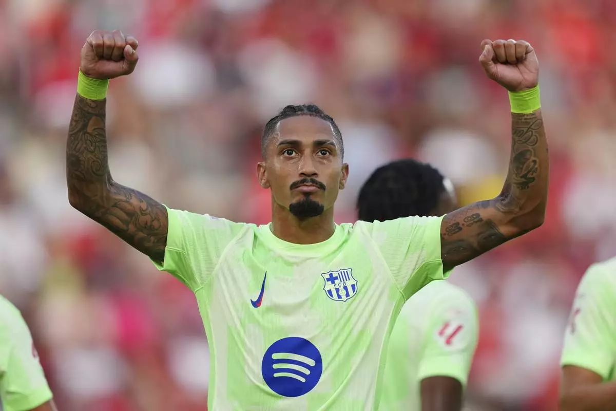 Barcelona's Raphinha celebrates after scoring during the La Liga soccer match between Mallorca and Barcelona in Mallorca, Spain, Saturday, Aug. 16, 2025. (AP Photo/Joan Mateu Parra)