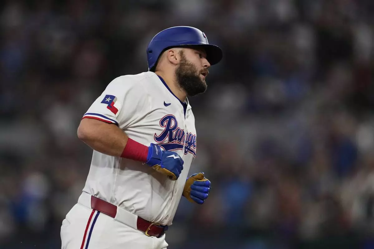Texas Rangers' Jake Burger rounds the bases after hitting a two-run home run in the fourth inning of a baseball game against the Arizona Diamondbacks Wednesday, Aug. 13, 2025, in Arlington, Texas. (AP Photo/Tony Gutierrez)