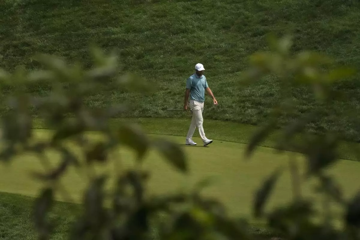 Sam Burns walks off the ninth tee during the final round of the BMW Championship golf tournament Sunday, Aug. 17, 2025, in Owings Mills, Md. (AP Photo/Stephanie Scarbrough)