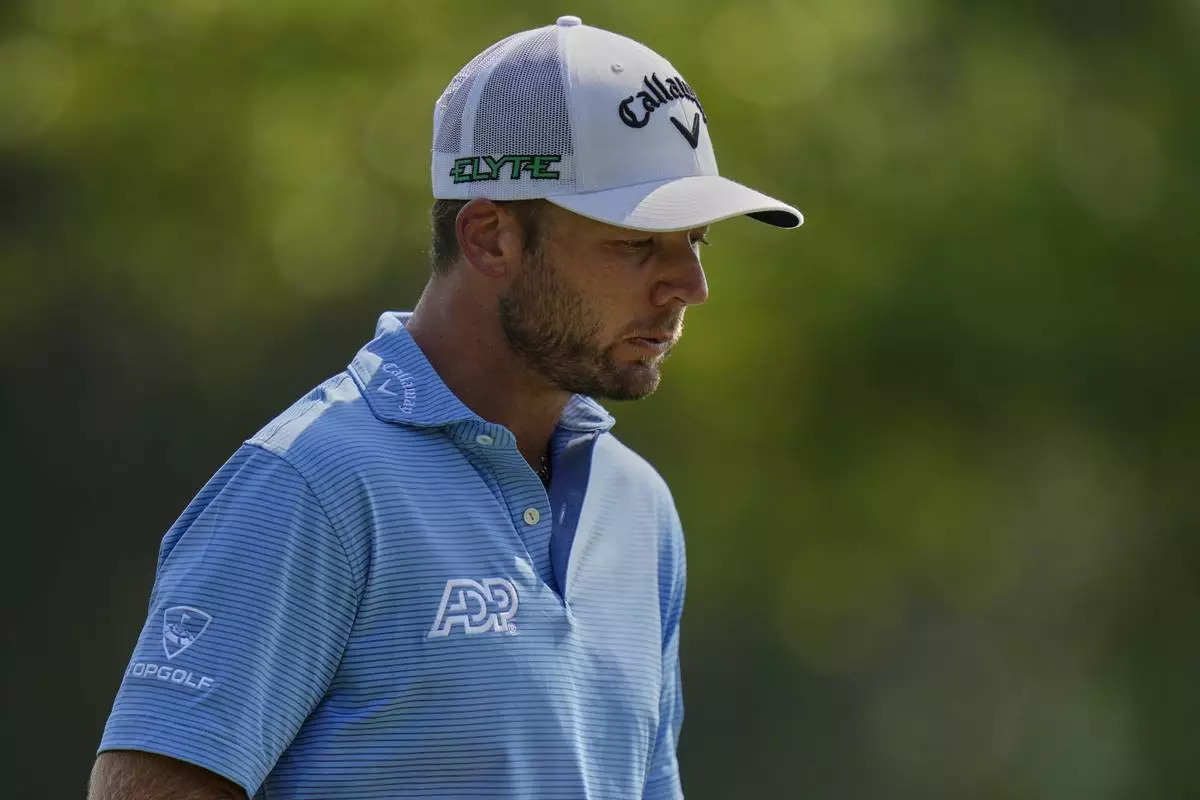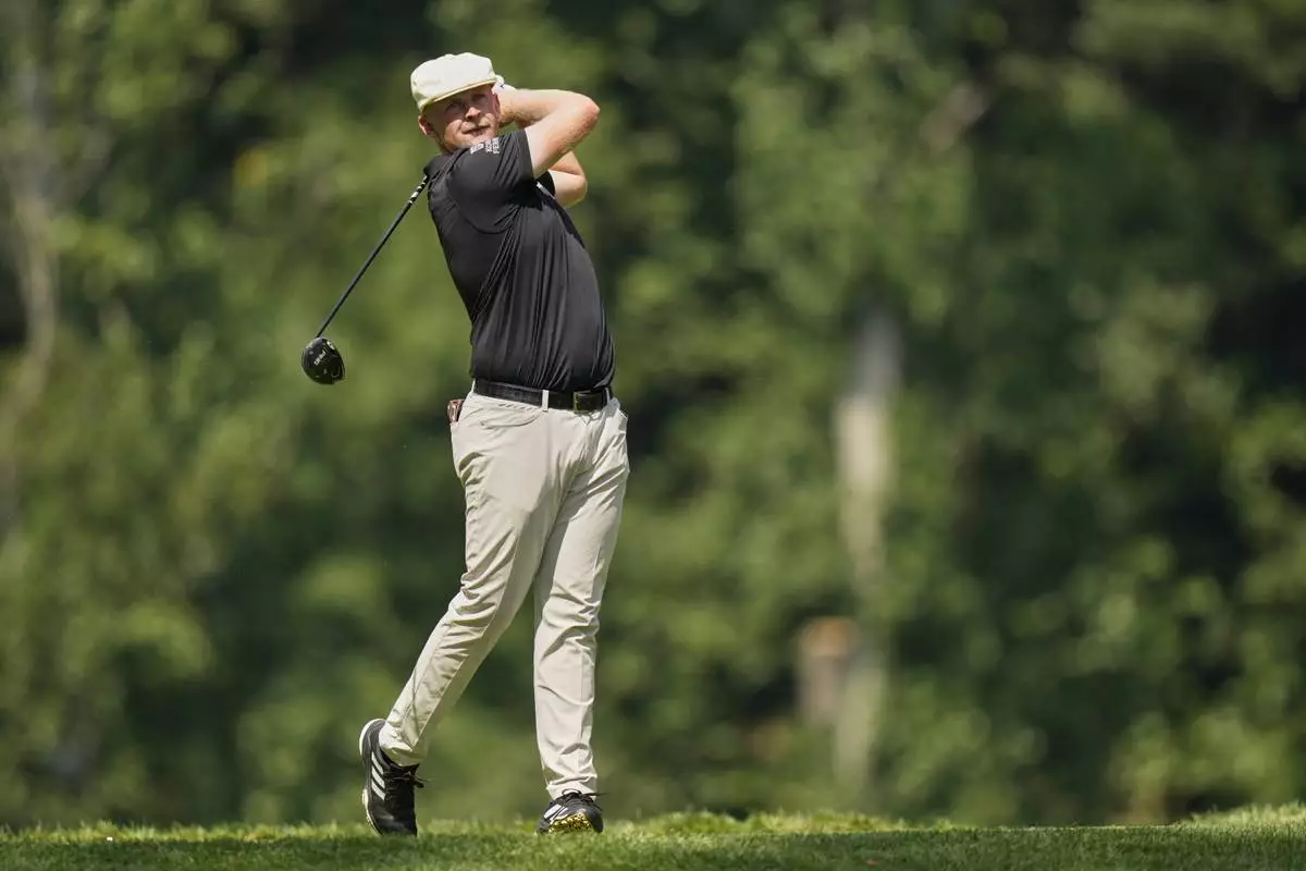 Harry Hall, of England, hits off the seventh tee during the final round of the BMW Championship golf tournament Sunday, Aug. 17, 2025, in Owings Mills, Md. (AP Photo/Stephanie Scarbrough)
