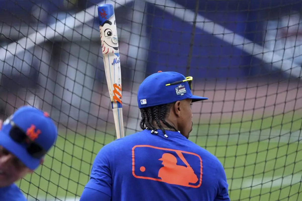 New York Mets' Francisco Lindor holds his Players' Weekend bat while waiting his turn in the batting cage before the Little League Classic baseball game against the Seattle Mariners at Bowman Field in Williamsport, Pa., Sunday, Aug. 17, 2025. (AP Photo/Gene J. Puskar)
