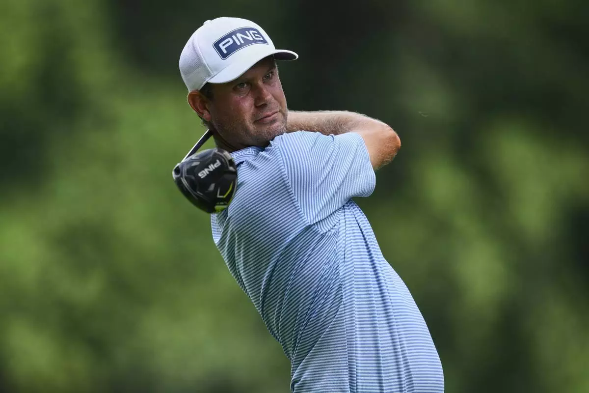 Harris English hits from the seventh tee during the first round of the BMW Championship golf tournament Thursday, Aug. 14, 2025, in Owings Mills, Md. (AP Photo/Nick Wass)