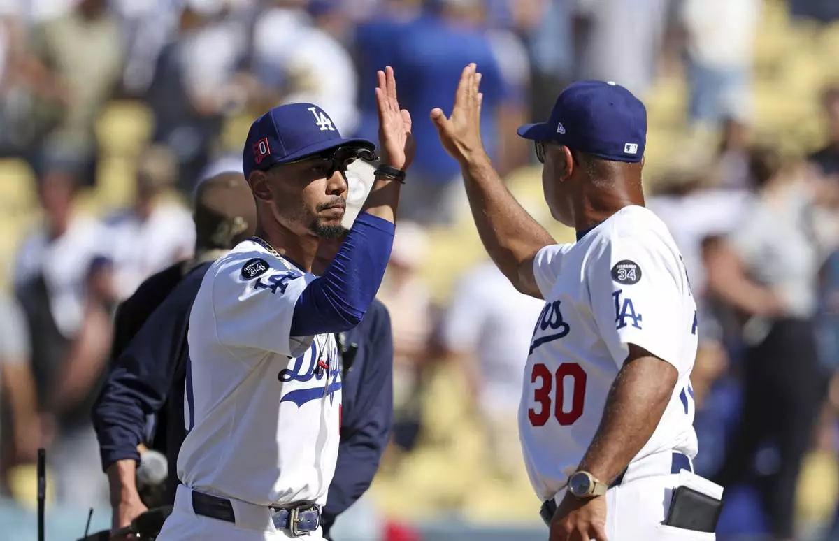 Los Angeles Dodgers shortstop Mookie Betts, left, celebrates with manager Dave Roberts after sweeping the San Diego Padres, Sunday, Aug. 17, 2025, in Los Angeles. (AP Photo/Kevork Djansezian)