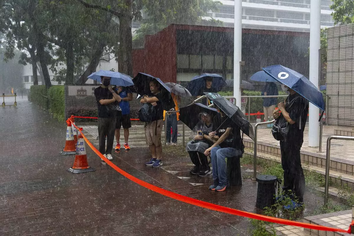 People wait to enter the West Kowloon Magistrates' Courts ahead of the closing statements for Hong Kong activist publisher Jimmy Lai's national security trial in Hong Kong, Thursday, Aug. 14, 2025. (AP Photo/Chan Long Hei)
