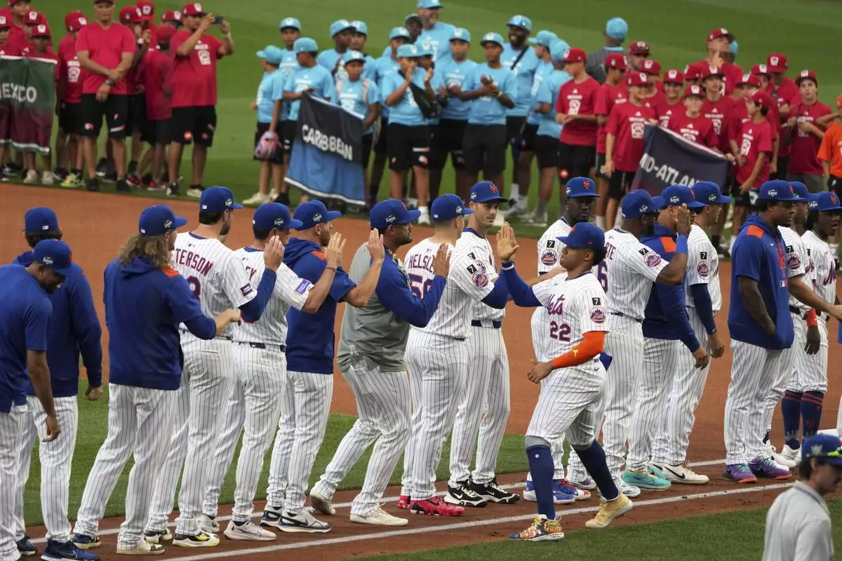 For the big leaguers, the annual game is a throwback of sorts to their own youth baseball days. Mets pitcher Sean Manaea traded pins. Raleigh's chest protector featured a baseball card design of teammates and coaches from when they were kids. And yes, managers for both teams held their breath as players went cardboard sledding at Lamade Stadium.