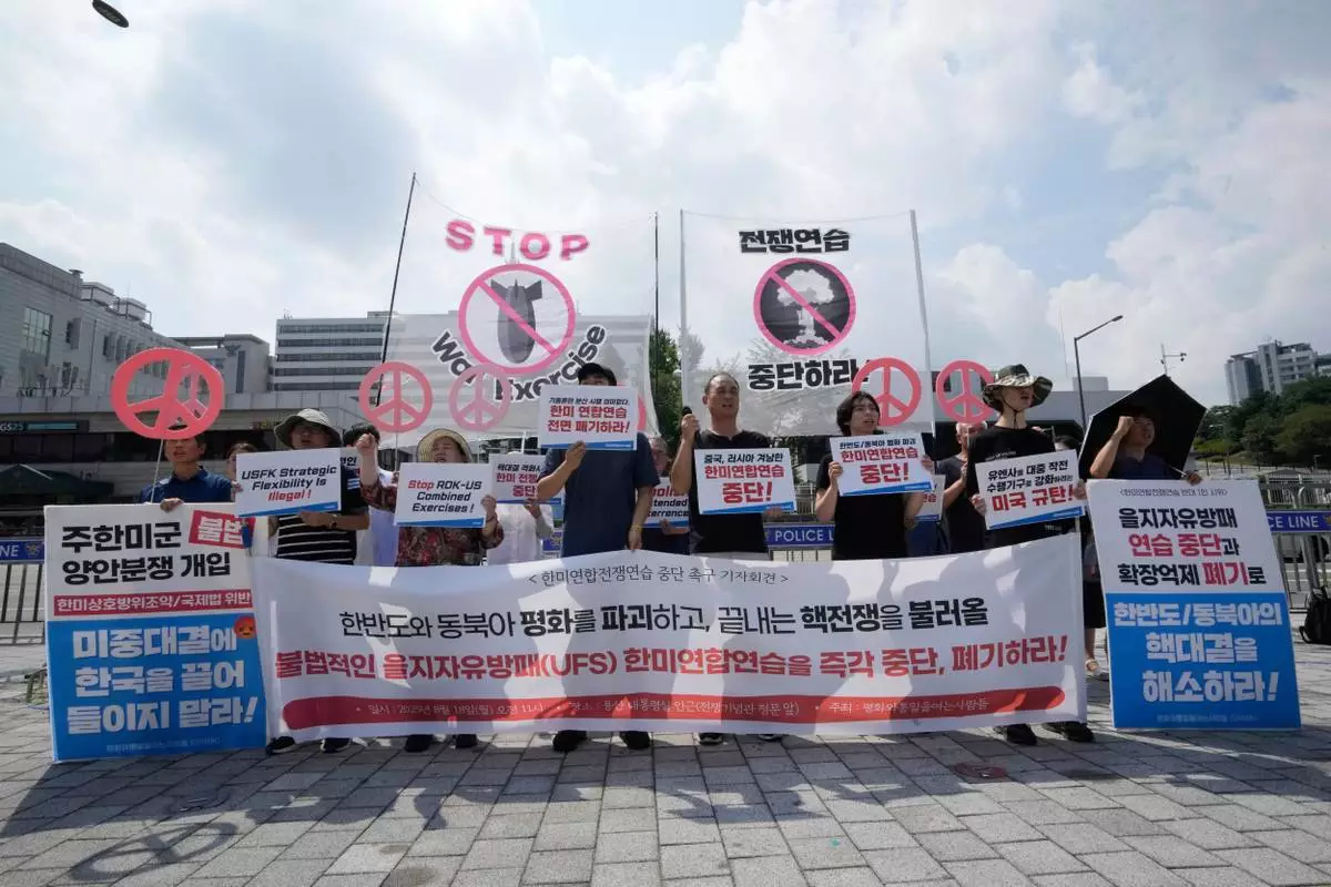 South Korean protesters stage a rally to oppose the joint military exercises, Ulchi Freedom Shield or UFS, between the U.S. and South Korea in front of the presidential office in Seoul, South Korea, Monday, Aug. 18, 2025. The banners read "Stop the military exercise between the U.S. and South Korea." (AP Photo/Ahn Young-joon)