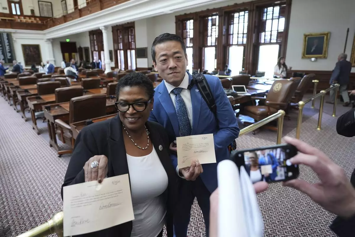 Texas state Reps. Toni Rose, left, and Gene Wu, right, pose for photos with their permission slips that allow them to leave the House Chamber, Monday, Aug. 18, 2025, in Austin, Texas. (AP Photo/Eric Gay)