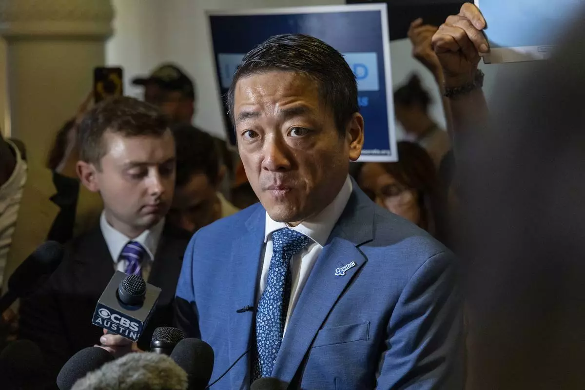 Texas state Rep. Gene Wu speaks to media outside the house chambers at the Texas Capitol in Austin, Texas, Monday, Aug. 18, 2025. (AP Photo/Stephen Spillman)