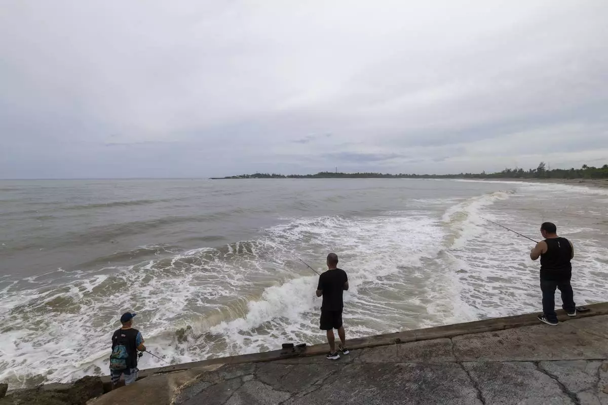 People fish along the shore in Arecibo, Puerto Rico, as Hurricane Erin brings rains to the island, Sunday, Aug. 17, 2025. (AP Photo/Alejandro Granadillo)