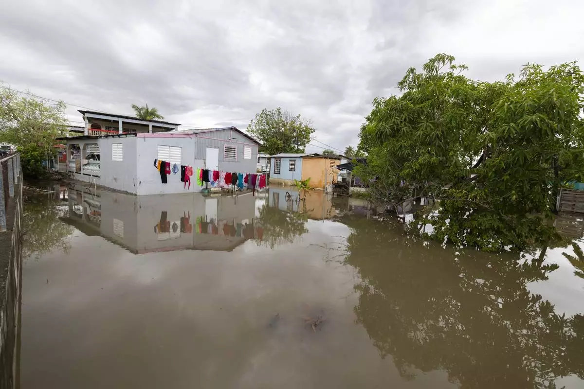 Water surrounds a house in Guayama, Puerto Rico, as Hurricane Erin brings rains to the island, Sunday, Aug. 17, 2025. (AP Photo/Alejandro Granadillo)
