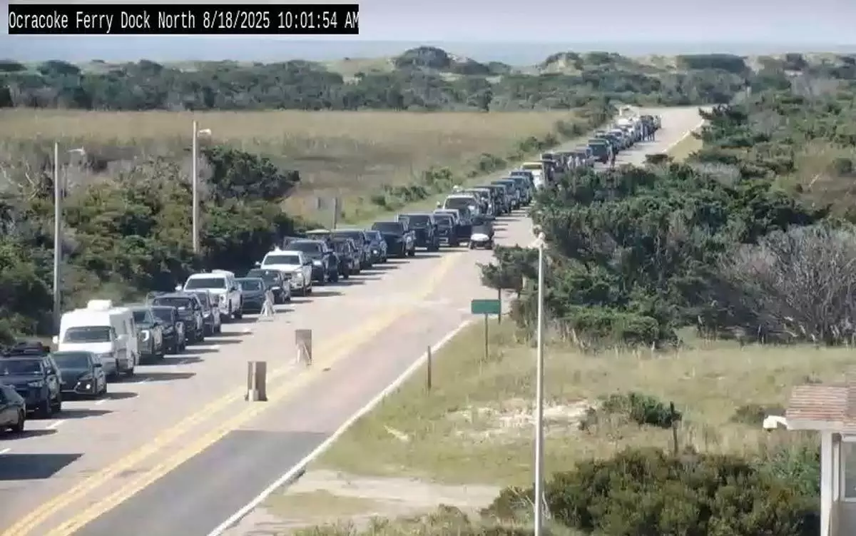 CORRECTS LOCATION: In this image taken from the North Carolina Department of Transportation camera, cars are lined up to evacuate via ferry from Ocracoke Island to Hatteras Island, N.C., Monday, Aug. 18, 2025, due to the expected impact of Hurricane Erin. (North Carolina Department of Transportation via AP)