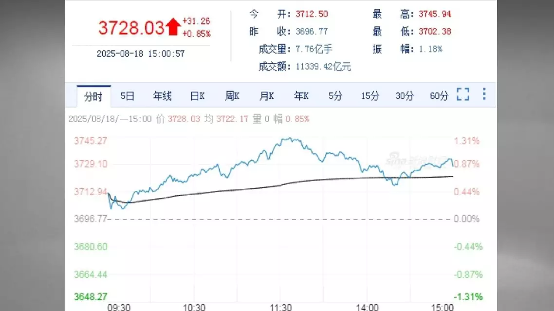 As of 11:30 midday closing, the Shanghai Composite Index surpassed the intraday high of 3,731.69 points, set on Feb 18, 2021, and reached 3,740.50, marking a new high since Aug 20, 2015.