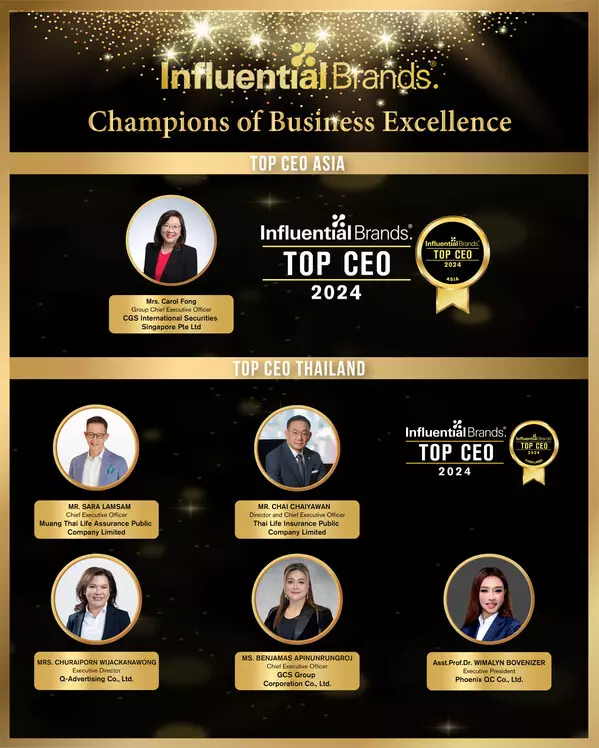 Among the distinguished brands and leaders recognised were Cotto, Mae Pranom, SCG JWD Logistics, and two prominent female CEOs—Ms Benjamas Apinunrungroj, CEO of GCS Group Corporation Co., Ltd., and Asst. Prof. Dr Wimalyn Bovenizer, Executive President of Phoenix QC Co., Ltd.—both of whom attended the 2025 Asia CEO Summit & Award Ceremony in Singapore. At the event in Singapore, Ms. Carol Fong, Group CEO, CGS International Securities Singapore Pte Ltd was conferred with the title of Asia's Top CEO.