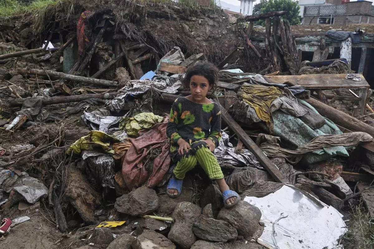 A girl sits over the rubble of her damaged home following Friday's flash flooding at a neighbourhood of Pir Baba, an area of Buner district, in Pakistan's northwest, Sunday, Aug. 17, 2025. (AP Photo/Muhammad Sajjad)