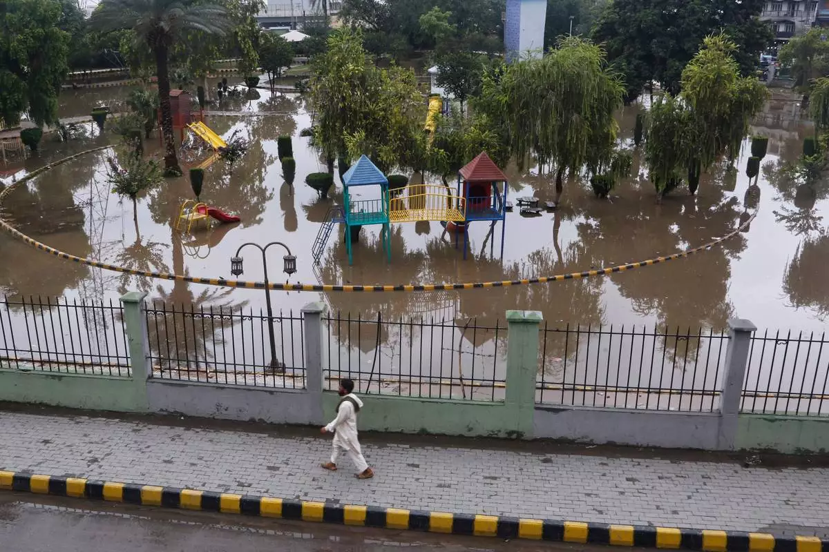 A man walks past a flooded park after heavy rainfall in Peshawar, Pakistan, Monday, Aug. 18, 2025. (AP Photo/Muhammad Sajjad)