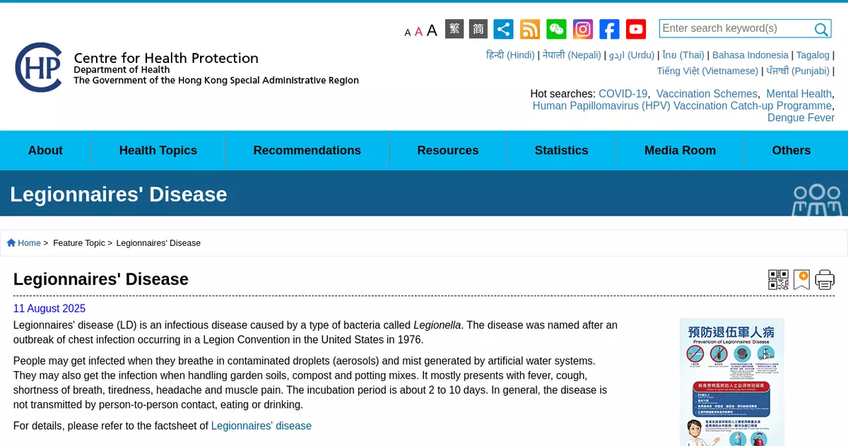 The Centre for Health Protection (CHP) of the Department of Health today (August 18) reported the latest number of cases of Legionnaires' disease (LD), and reminded the public of the importance of using and maintaining properly designed man-made water systems, adding that susceptible groups should strictly observe relevant precautions.