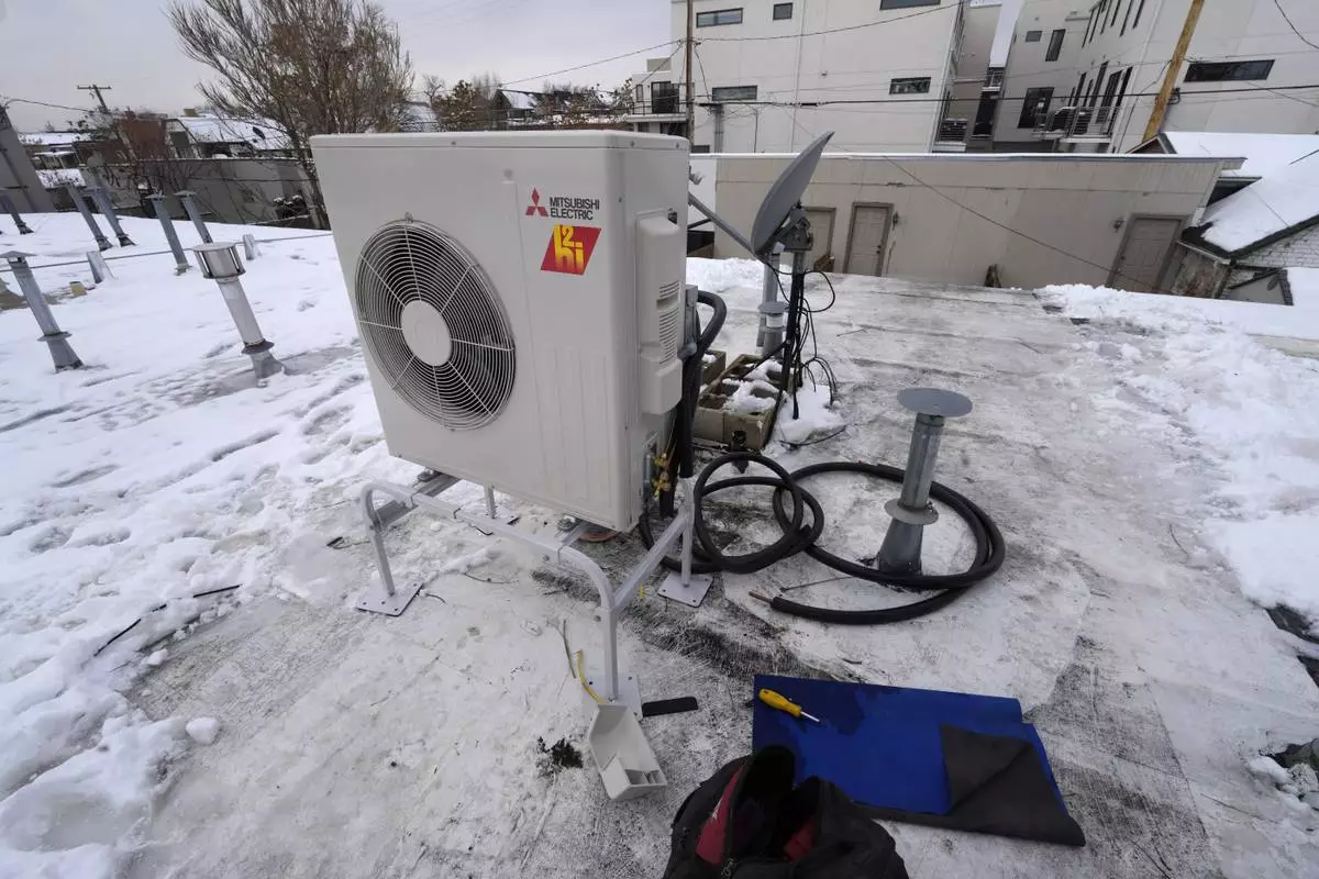 FILE - A condenser sits on the roof during the installation of a heat pump on Jan. 20, 2023, in Denver. (AP Photo/David Zalubowski, File)