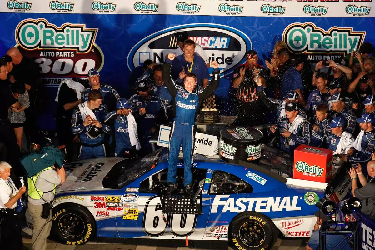 FILE - Nationwide Series driver Carl Edwards (60) celebrates winning the NASCAR Nationwide O'Reilly Auto Parts 300 auto race at Texas Motor Speedway in Fort Worth, Texas, April 8, 2011. (AP Photo/LM Otero, File)