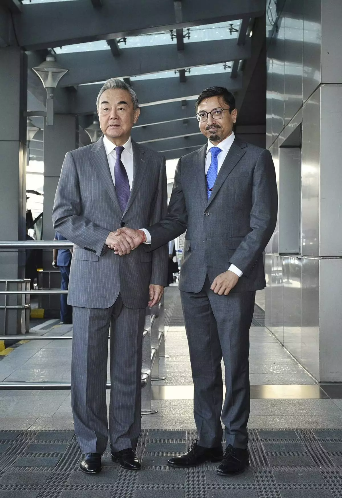 Chinese Foreign Minister Wang Yi, left, is welcomed by an unidentified Indian foreign ministry official upon his arrival at the airport in New Delhi, India, Monday, Aug. 18, 2025. (Indian Foreign Ministry on X via AP )
