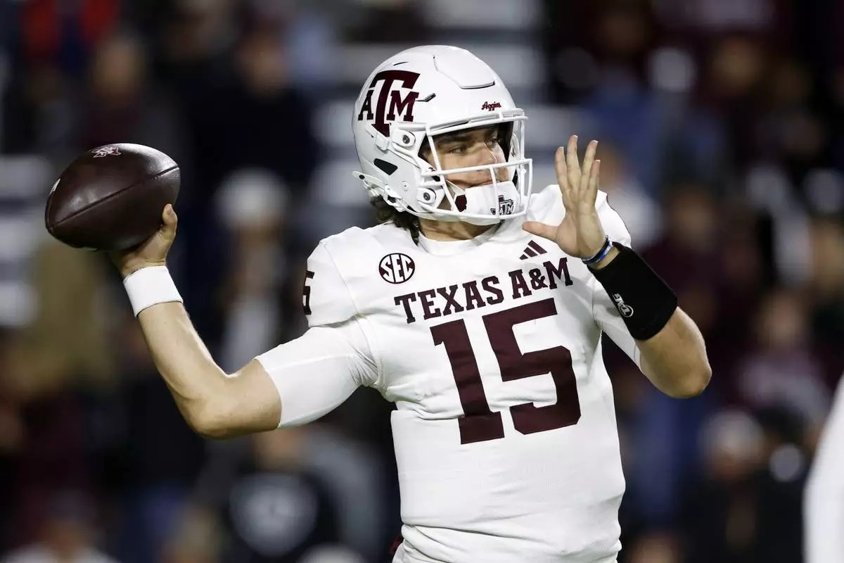 FILE - Texas A&M quarterback Conner Weigman warms up before an NCAA college football game against Auburn, Saturday, Nov. 23, 2024, in Auburn, Ala. (AP Photo/Butch Dill,File)