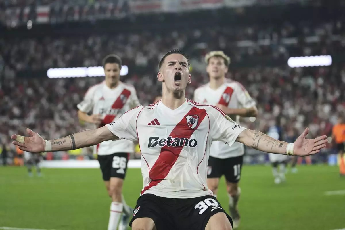 FILE - Franco Mastantuono of Argentina's River Plate celebrates after scoring from the penalty spot his side's third goal against Ecuador's Independiente del Valle during a Copa Libertadores Group B soccer match at the Monumental stadium in Buenos Aires, Argentina, Thursday, May 15, 2025. (AP Photo/Gustavo Garello, File)
