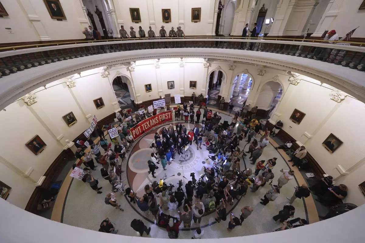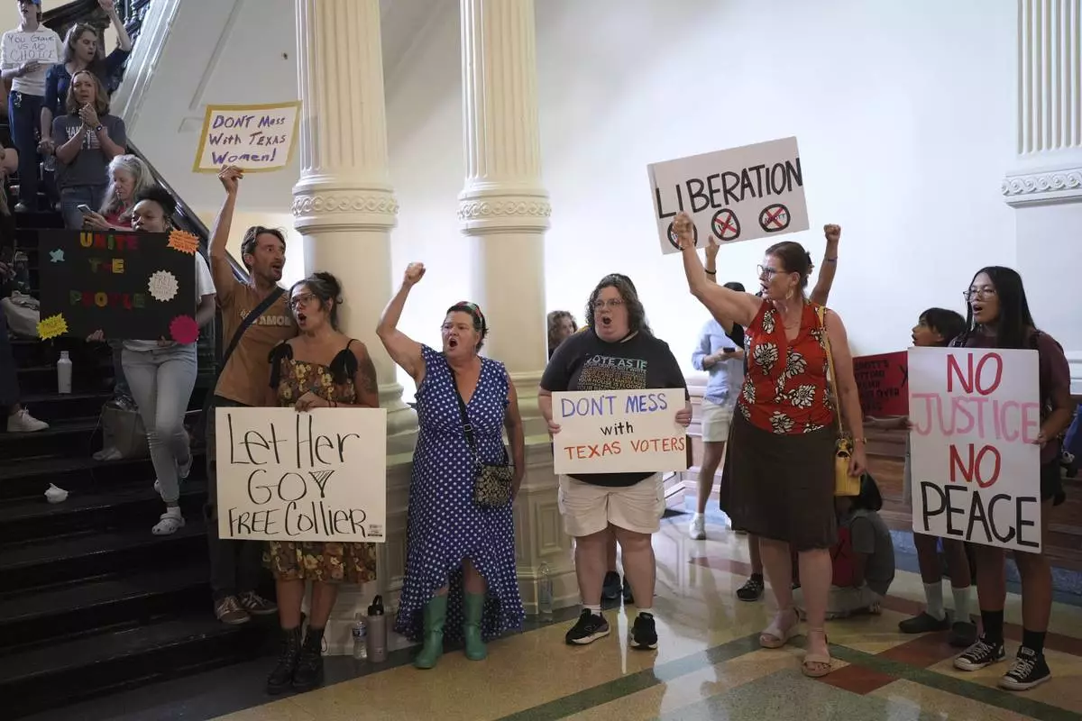 Protesters gather outside of the House Chamber where Democratic Texas state Rep. Nicole Collier refuses to leave due to a required law enforcement escort, Tuesday, Aug. 19, 2025, in Austin, Texas. (AP Photo/Eric Gay)