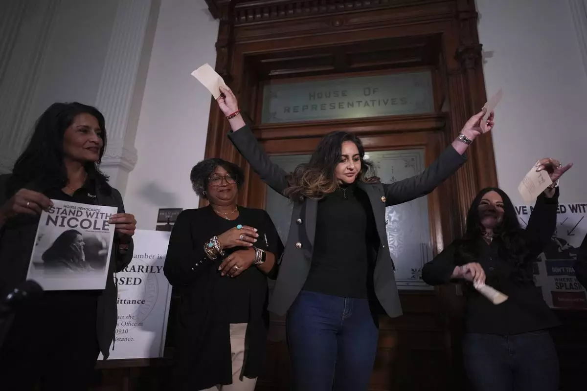 Democratic Texas state Rep. Mihaela Plesa, center, and Rep. Cassandra Garcia Hernandez, right, tear up their 'permission slips' outside of the House Chamber as they plan to join fellow Rep. Nicole Collier who refuses to leave due to a required law enforcement escort, Tuesday, Aug. 19, 2025, in Austin, Texas. (AP Photo/Eric Gay)