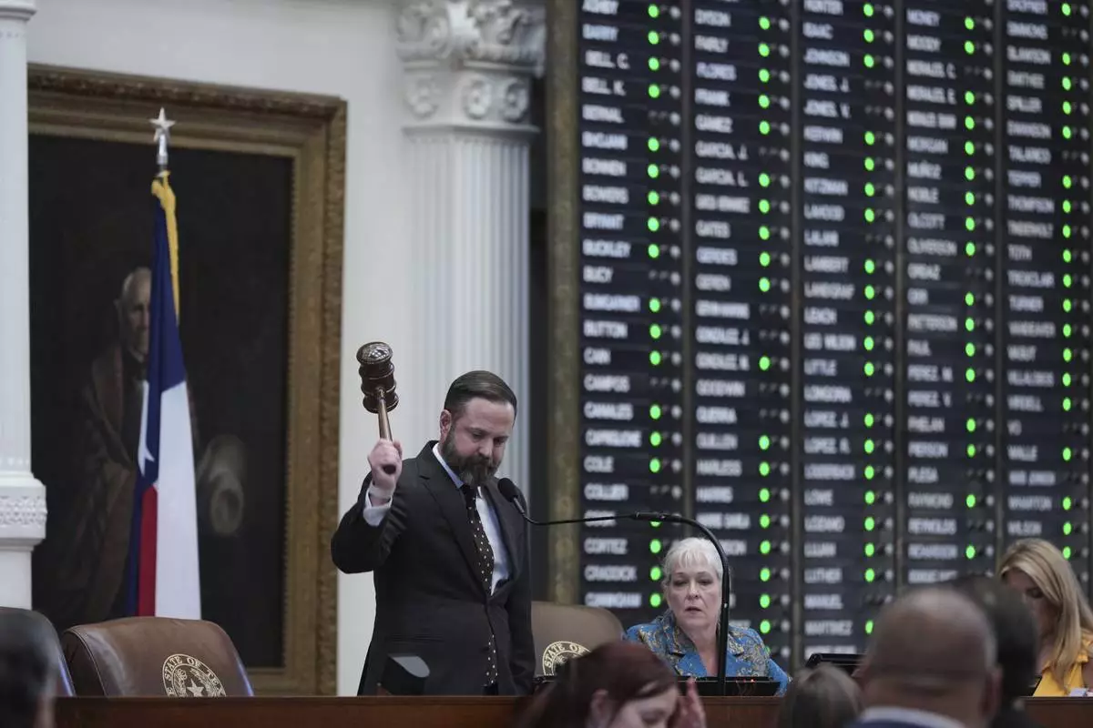 Texas Speaker of the House Dustin Burrows strikes the gavel as the House calls a Special Session with a quorum, Monday, Aug. 18, 2025, in Austin, Texas. (AP Photo/Eric Gay)
