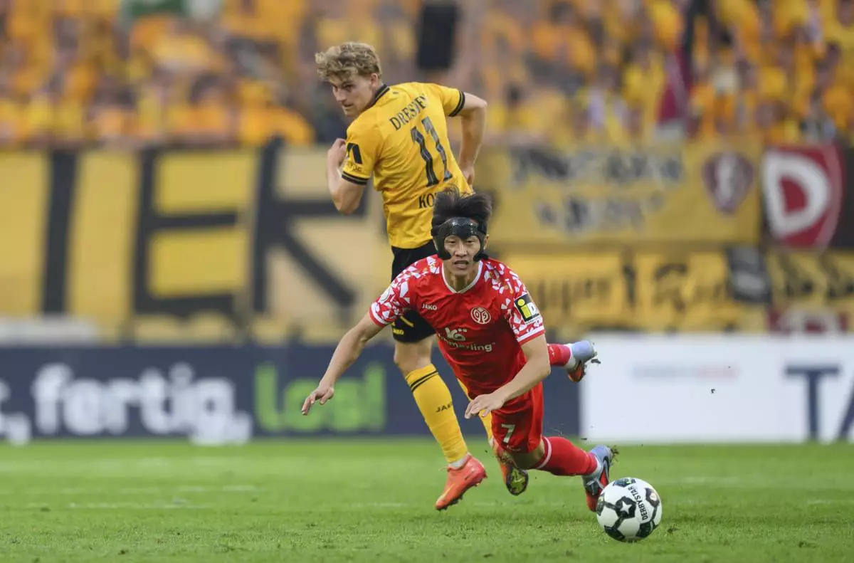 Dresden's Dominik Kother, rear, and Mainz' Jae-sung Lee, front, challenge for the ball during the German soccer cup first round match between Dynamo Dresden and FSV Mainz 05 in Dresden, Germany, Monday, Aug. 18, 2025. (Robert Michael/dpa via AP)