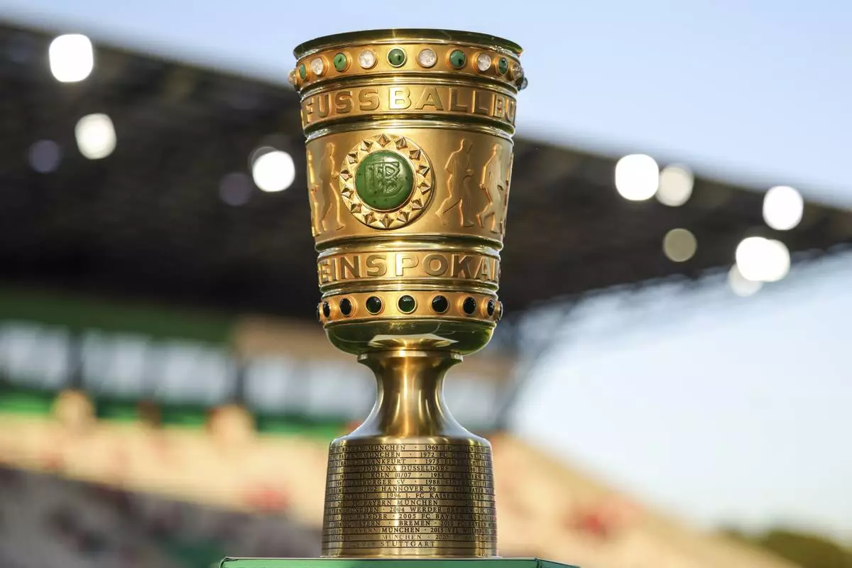 The German soccer cup trophy is displayed before the German soccer cup first round match between Rot Weiss Essen and Borussia Dortmund in Essen, Germany, Monday, Aug. 18, 2025. (Christoph Reichwein/dpa via AP)