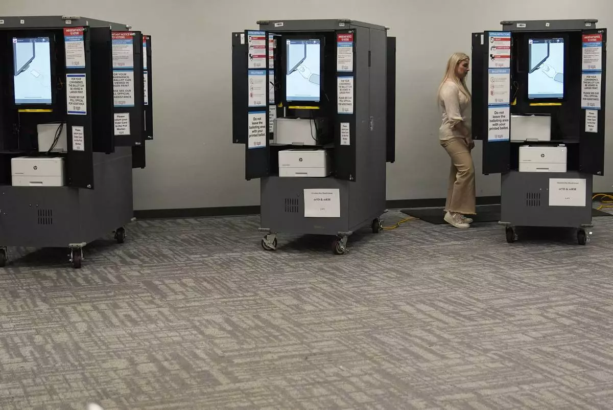 FILE - A person votes at a polling site for the presidential primary election March 12, 2024, in Atlanta. (AP Photo/Brynn Anderson, File)