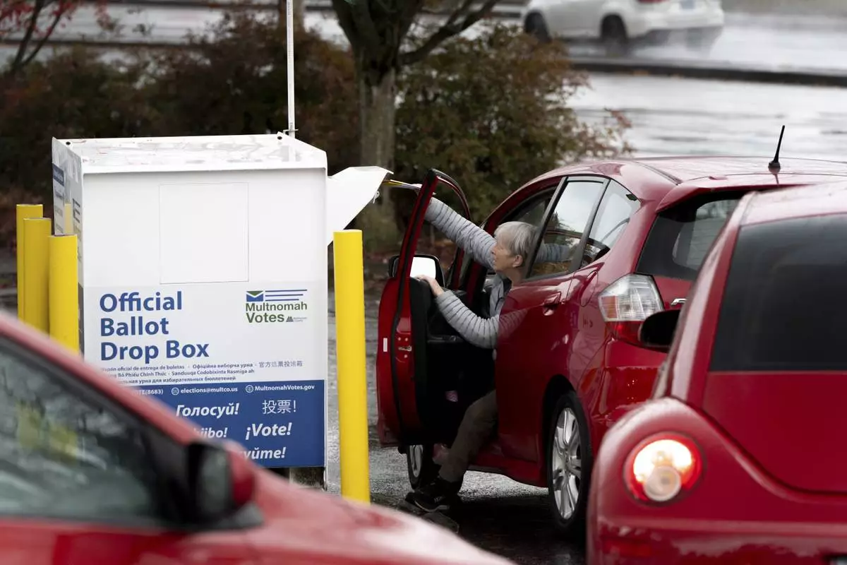 FILE - A voter drops off their ballot at a dropbox on Election Day, Nov. 5, 2024, in Portland, Ore. (AP Photo/Jenny Kane, File)