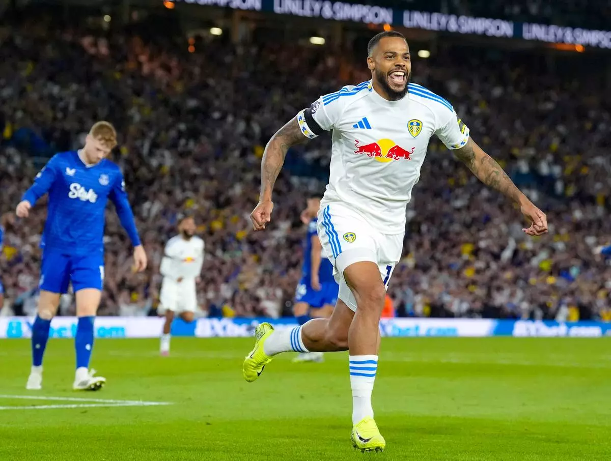Leeds United's Lukas Nmecha celebrates scoring their side's first goal of the game from a penalty during the English Premier League soccer match between Leeds United and Everton at Elland Road, in Leeds, England, Monday, Aug. 18, 2025. (Danny Lawson/PA via AP)