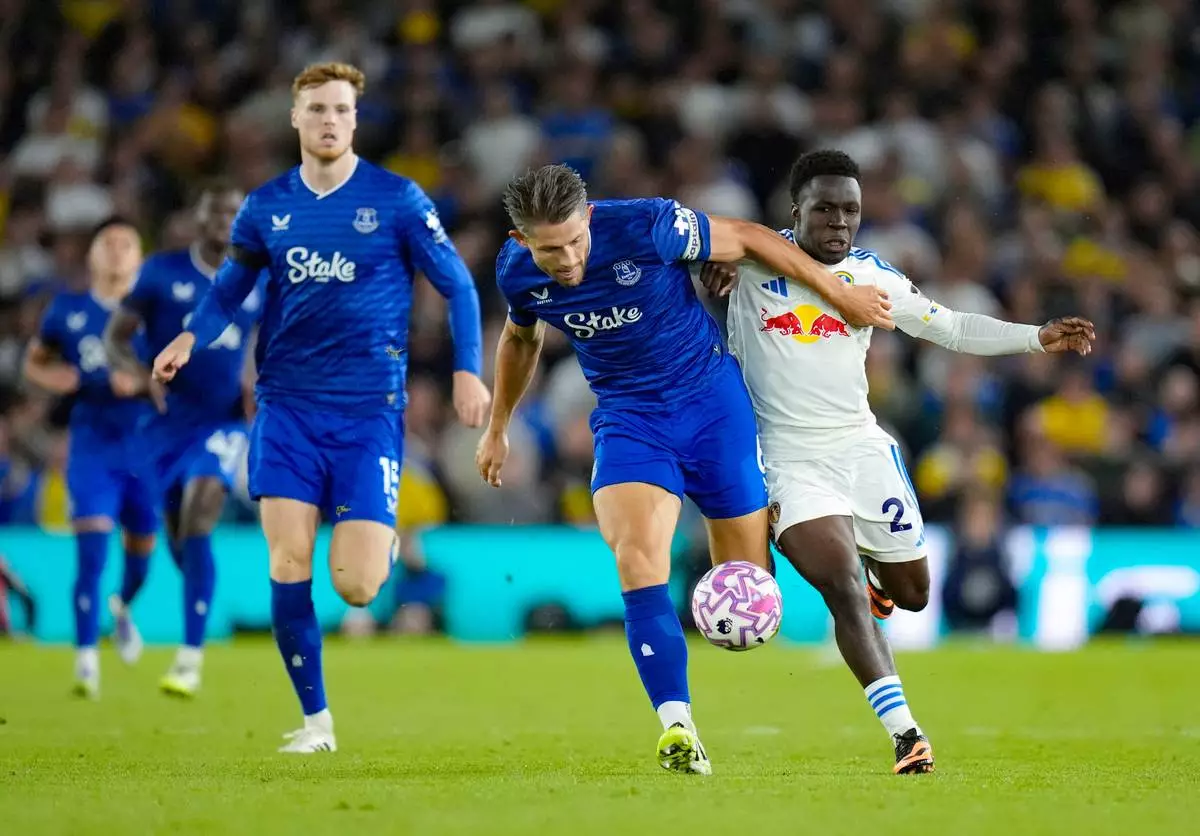 Everton's James Tarkowski and Leeds United's Wilfried Gnonto, right, battle for the ball during the English Premier League soccer match between Leeds United and Everton at Elland Road, in Leeds, England, Monday, Aug. 18, 2025. (Danny Lawson/PA via AP)