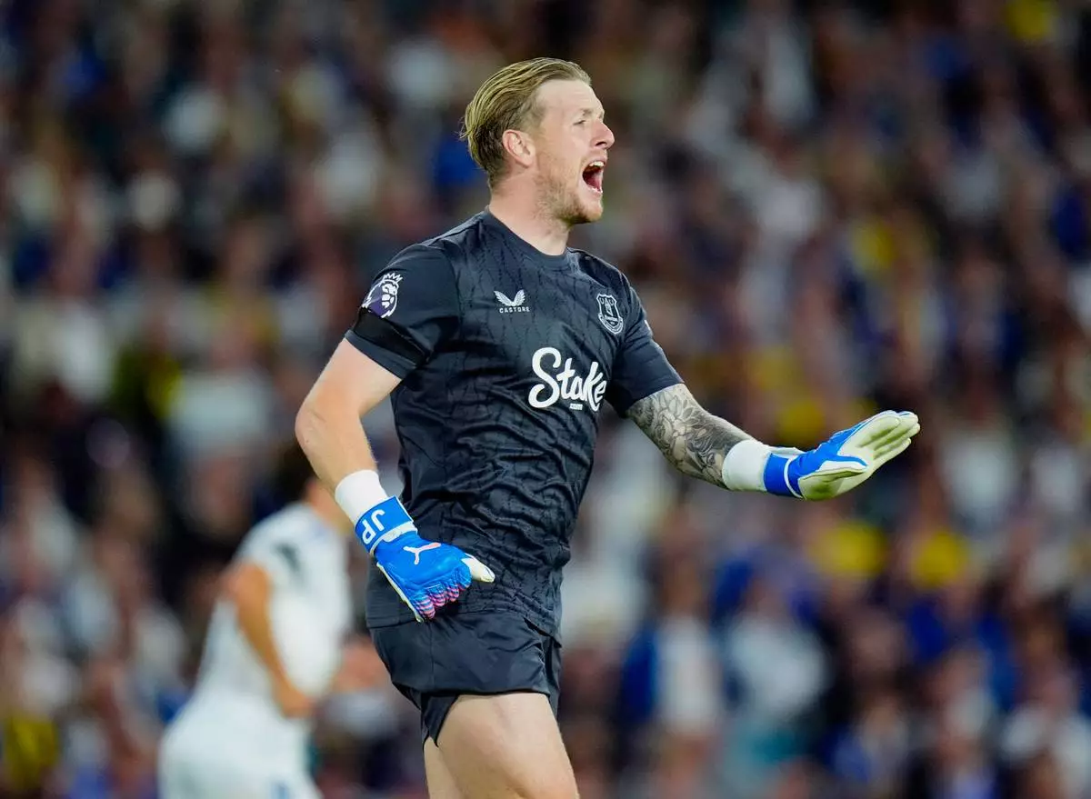 Everton goalkeeper Jordan Pickford in action during the English Premier League soccer match between Leeds United and Everton at Elland Road, in Leeds, England, Monday, Aug. 18, 2025. (Danny Lawson/PA via AP)