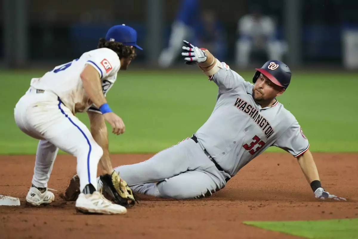 Washington Nationals first baseman Nathaniel Lowe (33) beats the tag at second by Kansas City Royals second baseman Adam Frazier after hitting a double during the fifth inning of a baseball game Monday, Aug. 11, 2025, in Kansas City, Mo. (AP Photo/Charlie Riedel)