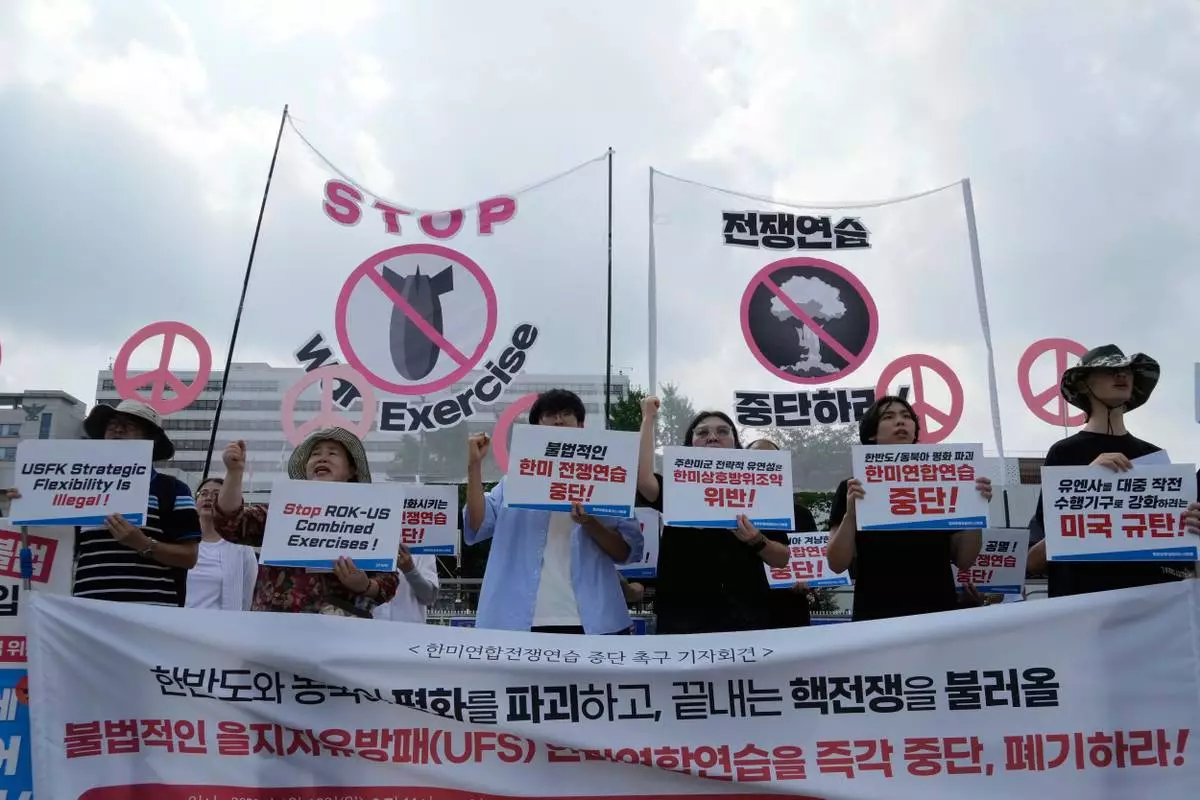 South Korean protesters stage a rally to oppose the joint military exercises, Ulchi Freedom Shield or UFS, between the U.S. and South Korea in front of the presidential office in Seoul, South Korea, Monday, Aug. 18, 2025. The banners read "Stop the military exercise between the U.S. and South Korea." (AP Photo/Ahn Young-joon)