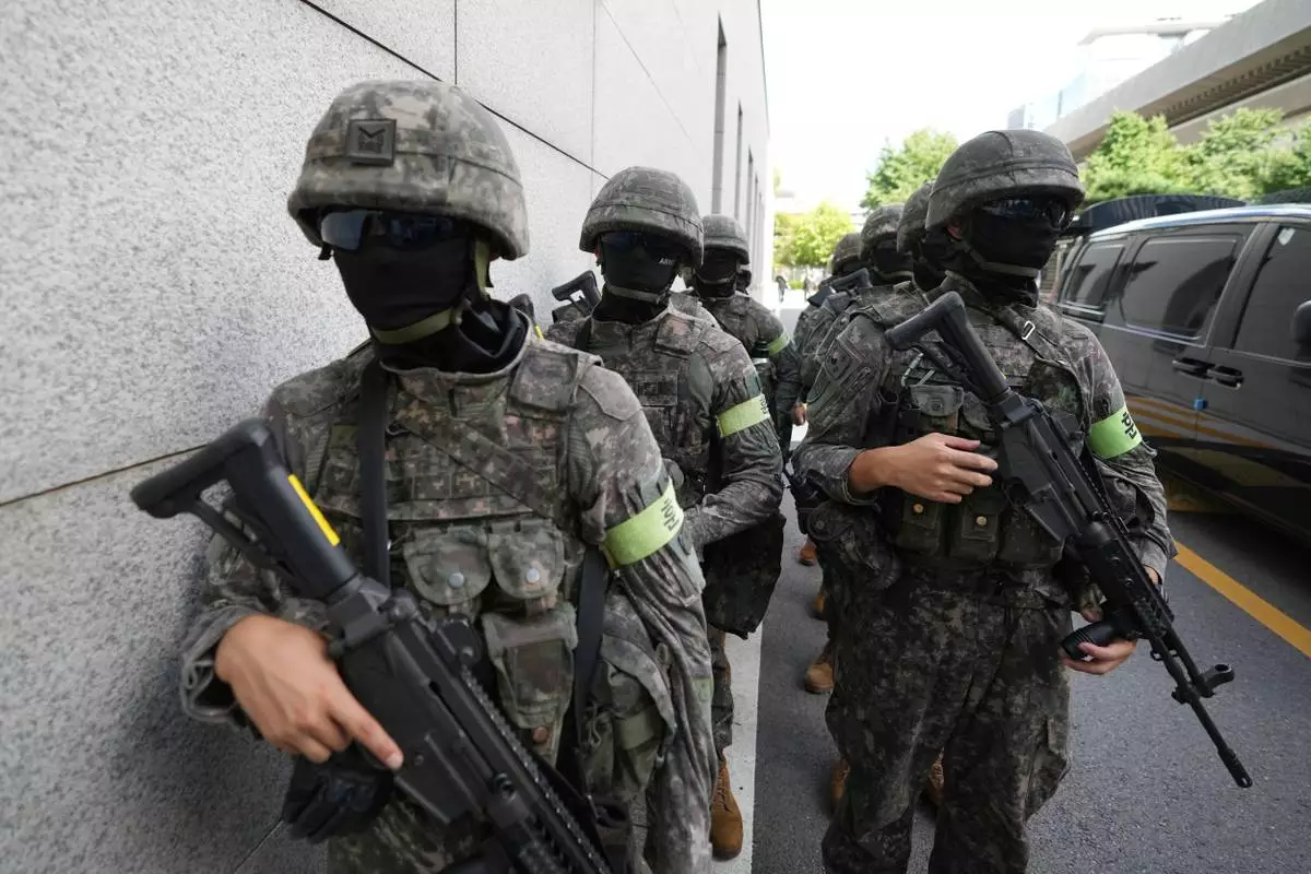 South Korean military soldiers arrive for an anti-terror drill as a part of the annual Ulchi exercise at the government building in Seoul, South Korea, Tuesday, Aug. 19, 2025. (AP Photo/Lee Jin-man)