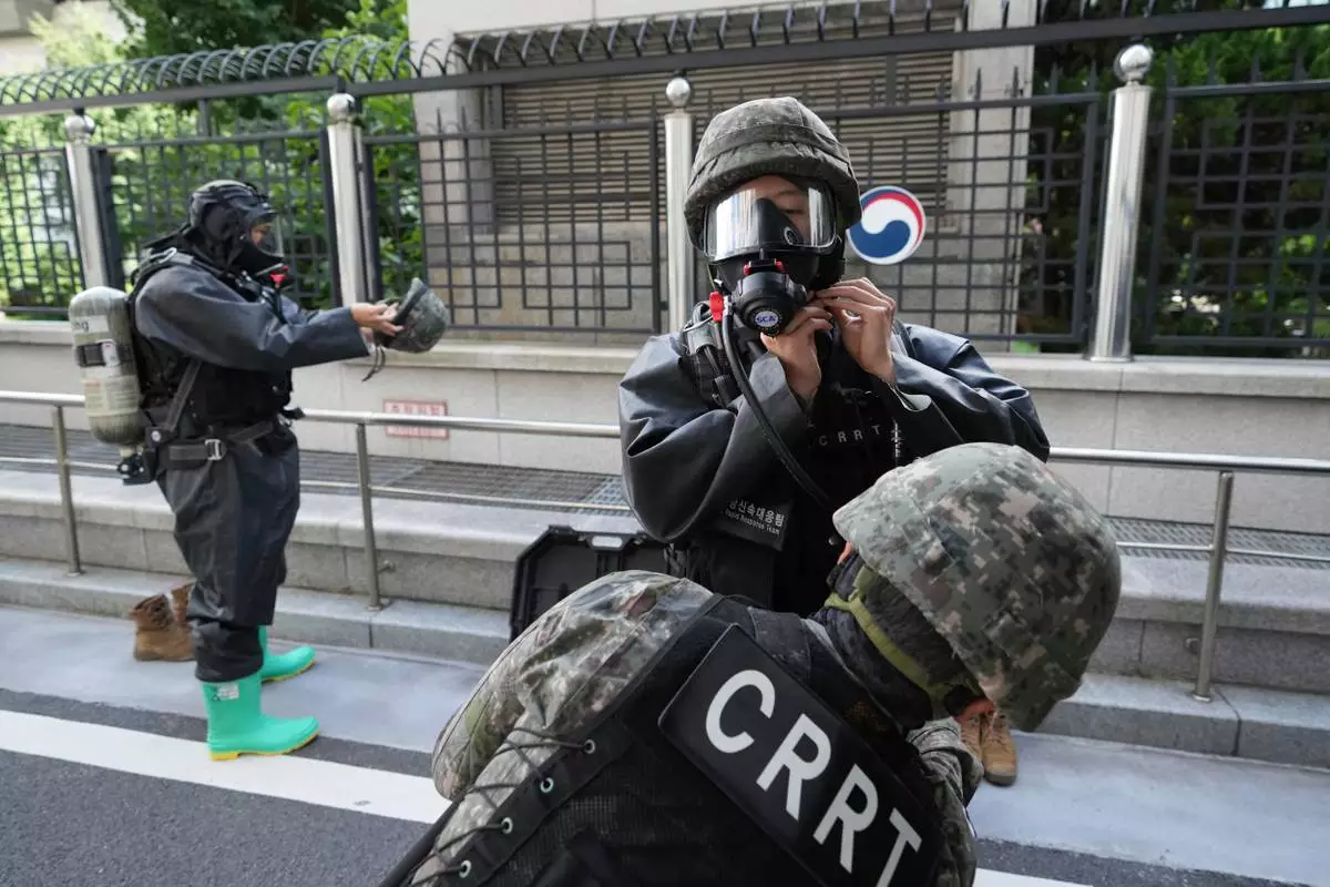 Members of Chemical, Biological, Radiological, and Nuclear Rapid Response Team from South Korean soldiers check up their gears upon their arrival for an anti-terror drill as a part of the annual Ulchi exercise at the government building in Seoul, South Korea, Tuesday, Aug. 19, 2025. (AP Photo/Lee Jin-man)